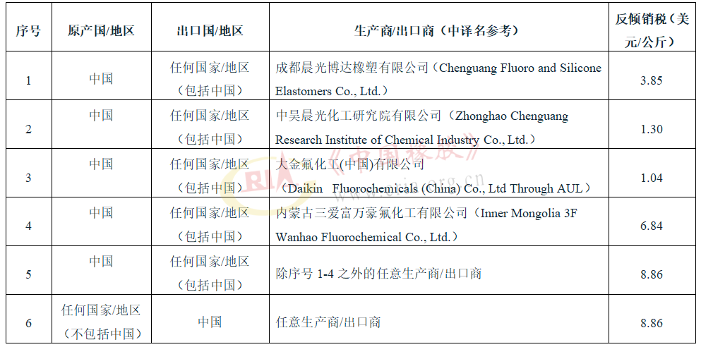 10月19日,印度商工部發(fā)布公告稱,對原產(chǎn)于或進口自中國的氟橡膠[Fluoroelastomers(FKM)]作出第一次反傾銷日落復審終裁,建議對中國涉案產(chǎn)品繼續(xù)征收反傾銷稅,詳細稅率見下表(附表:印度對華氟橡膠日落復審終裁征稅表),有效期為5年。此次涉案產(chǎn)品不包括氟橡膠化合物和全氟醚橡膠(FFKM)。本案涉及印度海關編碼39045090、39046990、39049000、39046910項下的產(chǎn)品。