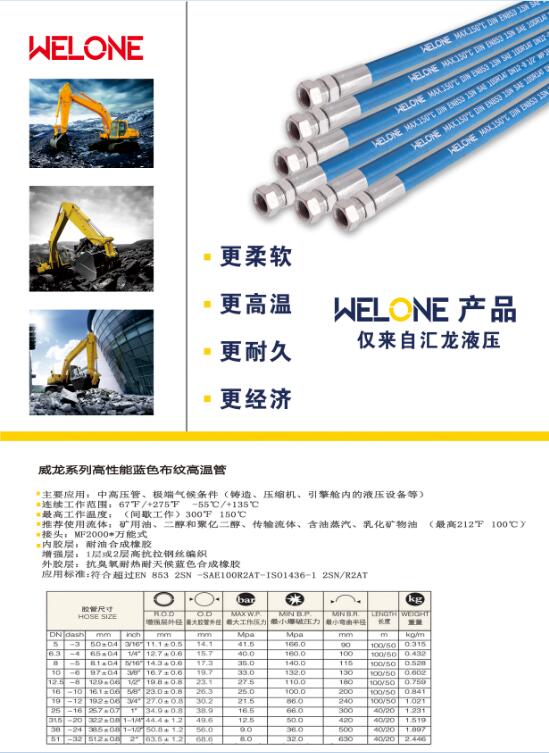 內(nèi)膠層采用耐油耐高溫合成橡膠,增強(qiáng)層為一層高抗拉鋼絲編織,外覆層編織一層耐高溫的藍(lán)色棉線,在使用體驗(yàn)和外觀上得到全面的升級。